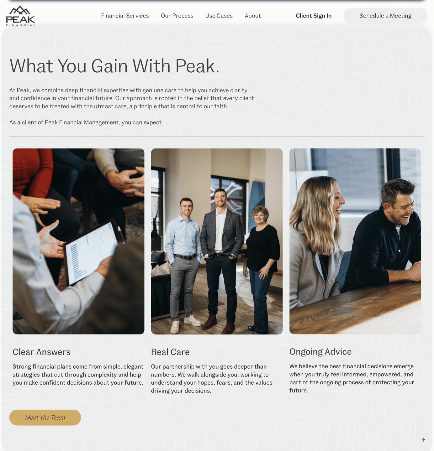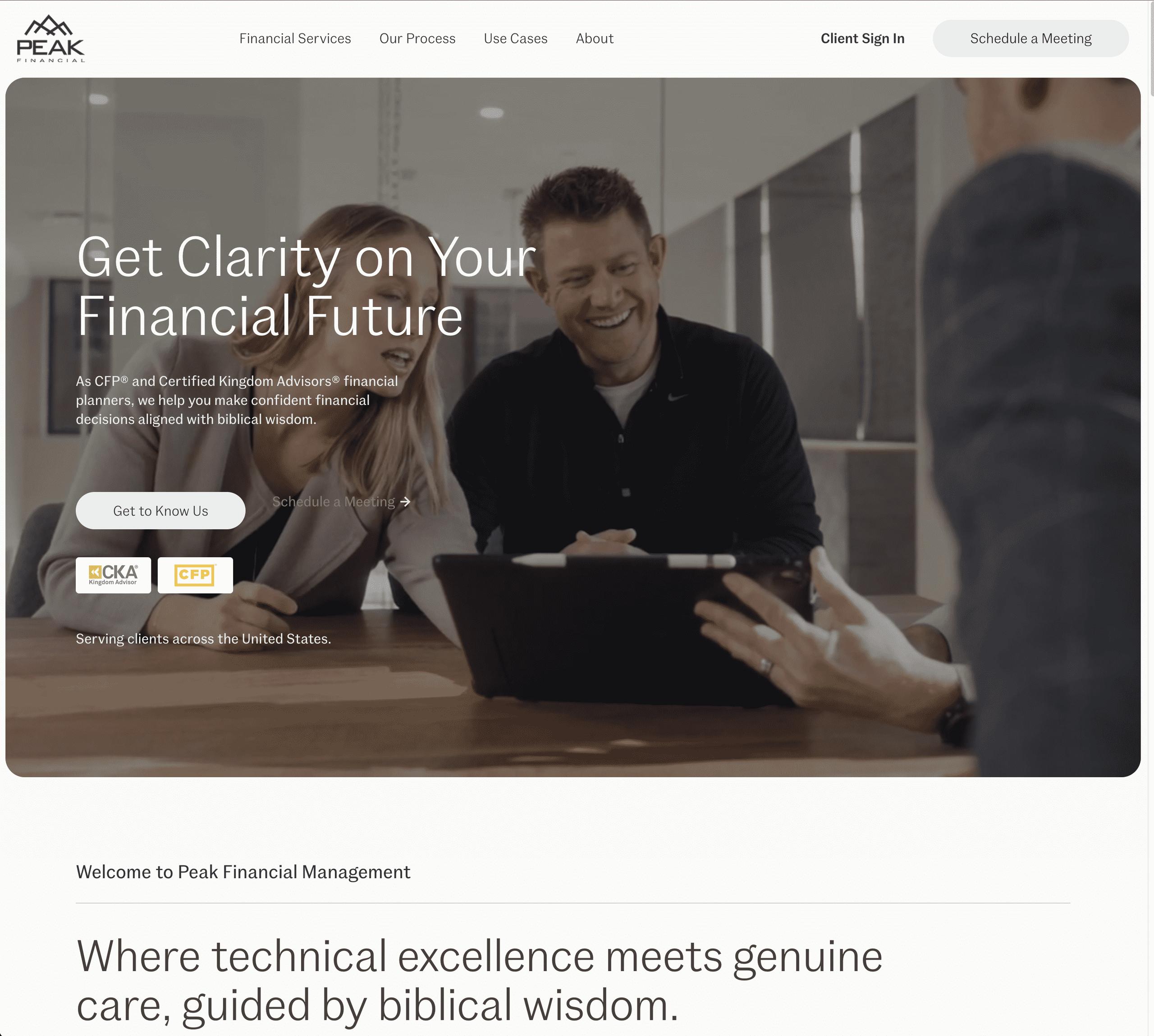 Peak Financial Management is a Christian financial advisory firm serving clients nationwide. Our team of Certified Financial Planners (CFP®) and Certified Kingdom Advisors (CKA®) combines technical excellence with genuine care—guided by biblical wisdom. We cater to individuals who have been blessed with significant wealth and want to ensure it is used for a significant impact. Our team helps you explore innovative ways to give, from donor-advised funds to impact-focused private equity. We provide the technical expertise of a CFP® to manage the complexities of your $5M+ estate and tax situation. Our CKA® certification ensures that every recommendation is weighed against biblical principles of stewardship. We help you manage the tension of enjoying your wealth while also holding it with an open hand. At Peak, we help you turn your financial success into a kingdom legacy.