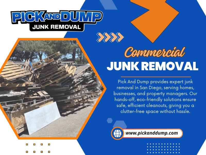 SAN DIEGO METRO'S COMPLETE JUNK REMOVAL SERVICE. We make clearing the junk and clutter from your Metro San Diego home or business a breeze. Our professional junk haulers arrive on time prepared to attend to every detail quickly and safely while you sit back and relax. Pick And Dump is the local junk removal company that goes above and beyond to provide you with a pleasant junk removal experience whether we pick up a single item or provide you with an entire property clean-out. We offer free no-obligation quotes with no surprises and excellent pricing. Just send us pictures of video of your unwanted stuff and get a free estimate in minutes!