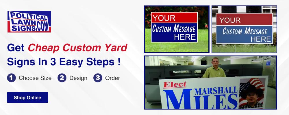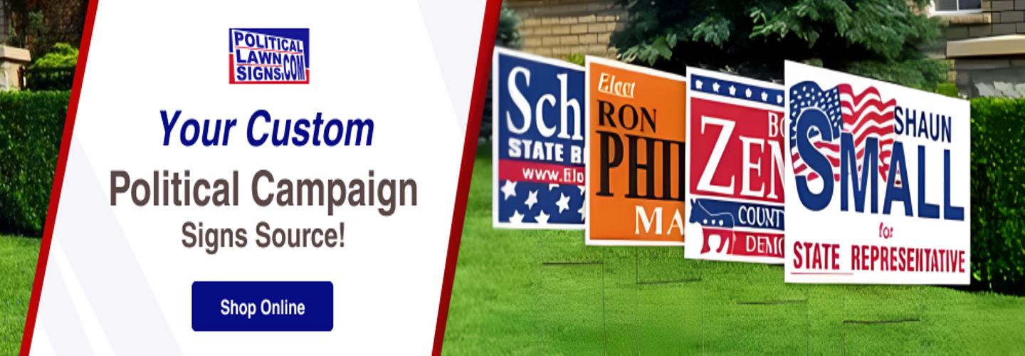 Make your message stand out with PoliticalLawnSigns.com's high-quality campaign lawn signs. Choose from cheap yard signs, sturdy political signs, and durable cardboard signs tailored to your campaign goals. PoliticalLawnSigns.com combines decades of experience and our expertise in screen and digital printing to design and print eye-catching signs. In addition to political signs, we also offer banners, stickers, and promotional products. Trust us as your one-stop shop for campaign materials. We handle it all so you can focus on your campaign!
