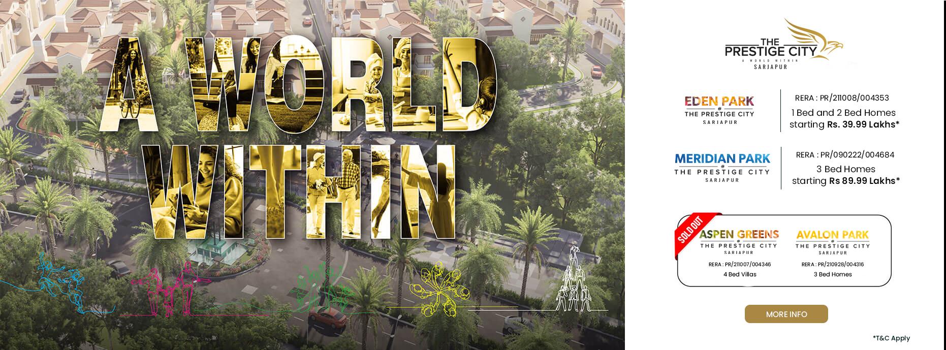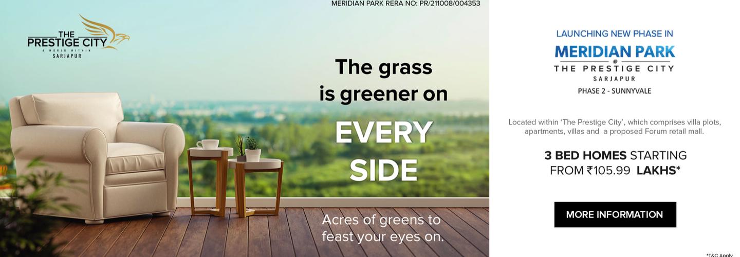 Prestige Meridian Park is a new residential apartment located at Sarjapur Road, East Bangalore and it offers 3 bhk flats spread over 18.2 acres of land with possession on 2025 onwrads developed by Prestige Group. Prestige City Meridian Park offers 2900 units developed by Prestige Constructions and it covers a wonderful greenery land.