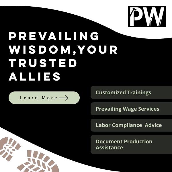 Prevailing Wisdom provides prevailing wage consulting services for customers in California. We offer prevailing wage services, labor compliance consulting, and assistance to make sure contractors meet public works requirements efficiently. Our team specializes in certified payroll reporting, compliance documentation services, and compliance training and education to simplify your projects. From contract compliance management to government contract consulting and contractor licensing, we offer complete support. Trust us for regulatory compliance assistance so that your projects stay on track and compliant from start to finish. Find out more about our prevailing wage consulting, labor compliance consulting, labor compliance assistance, prevailing wage support, and prevailing wage services on our website!