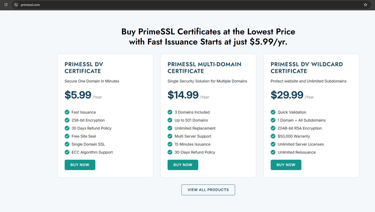 PrimeSSL, a leading Certificate Authority (CA) backed by the trusted Sectigo Root, delivers affordable and user-friendly SSL/TLS certificate solutions. Its offerings include Domain Validated (DV) SSL, Wildcard, Multi-Domain (SAN), and Multi-Domain Wildcard, tailored to the needs of personal websites, blogs, and small businesses.