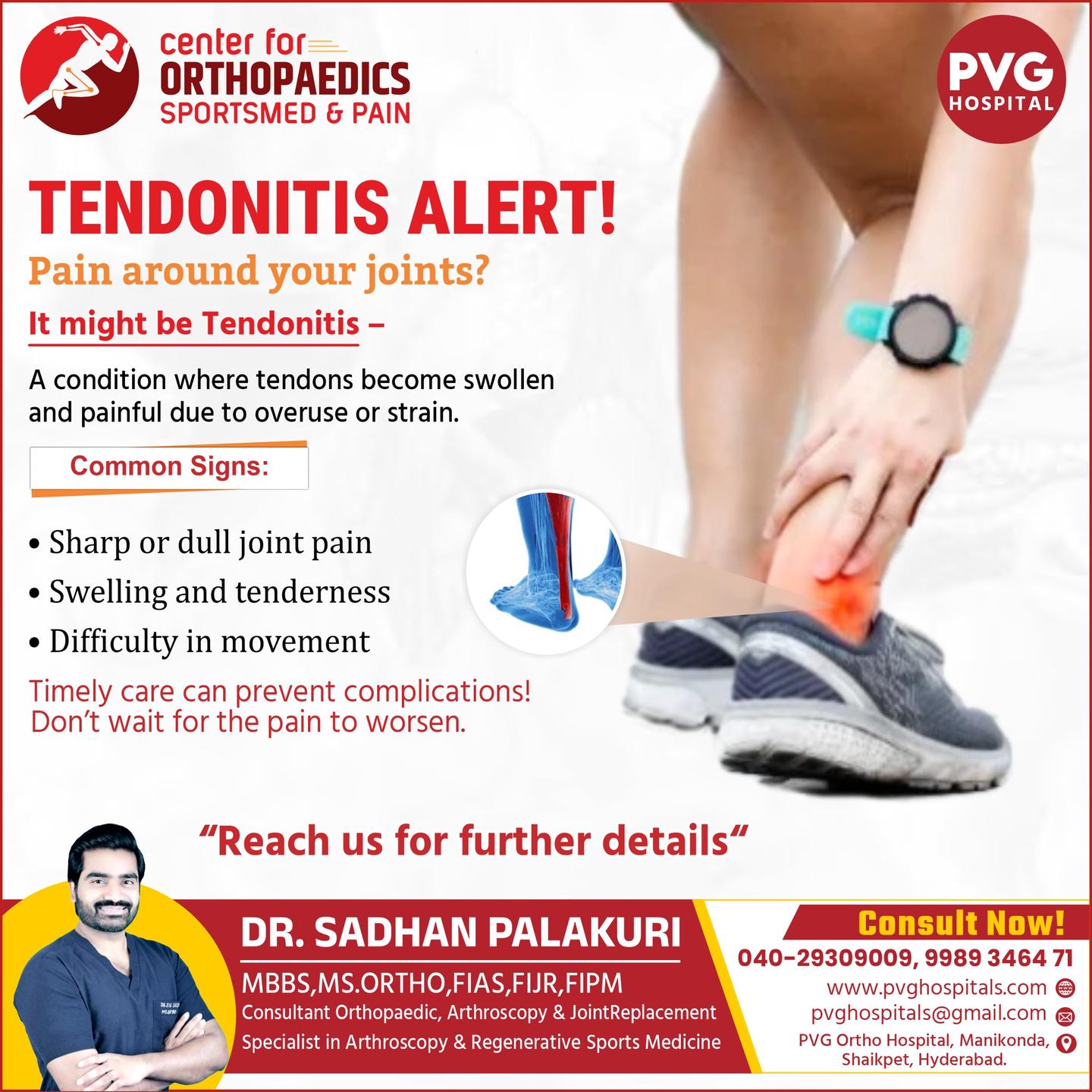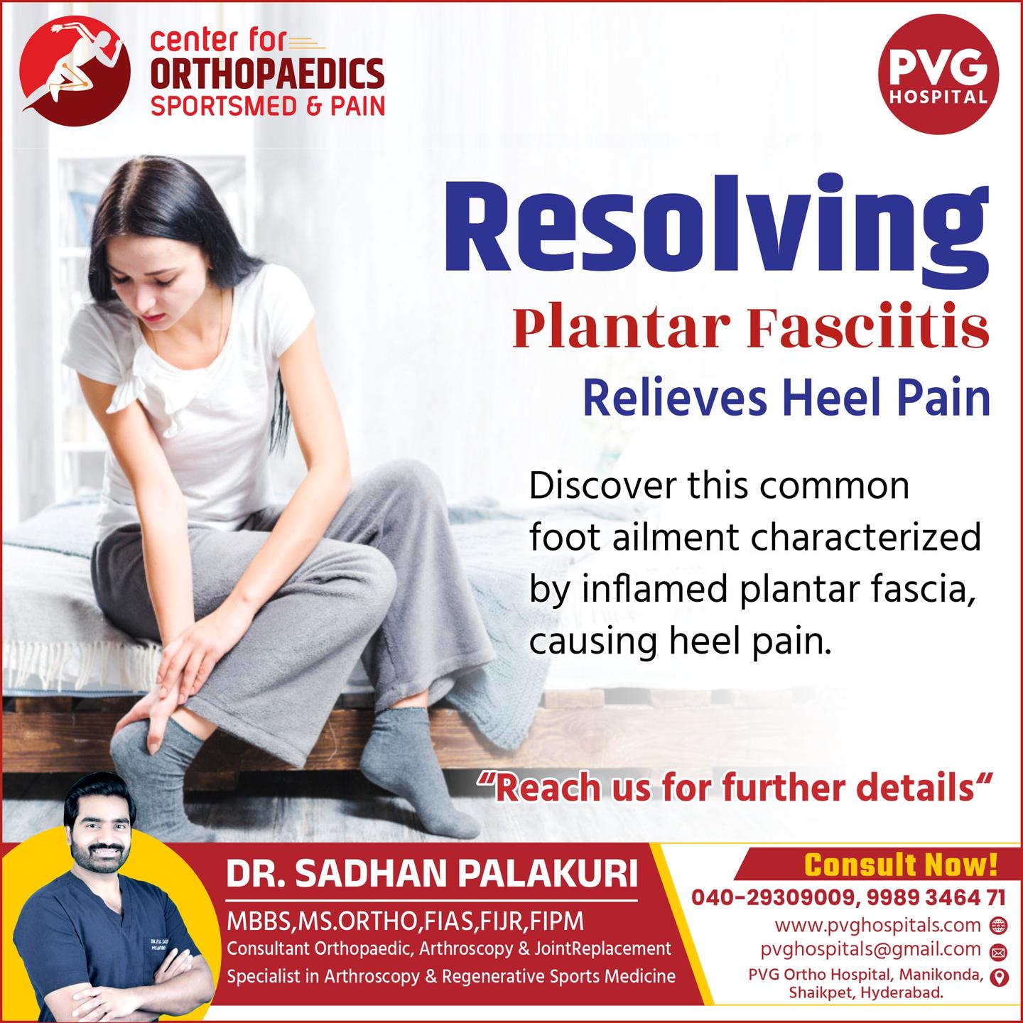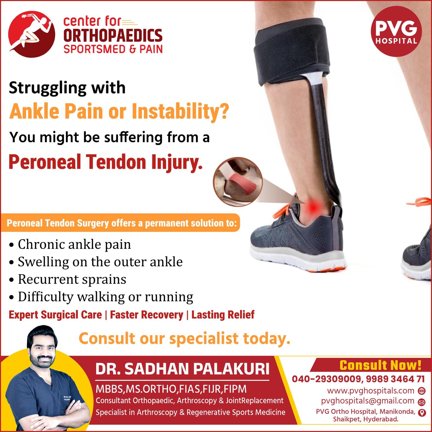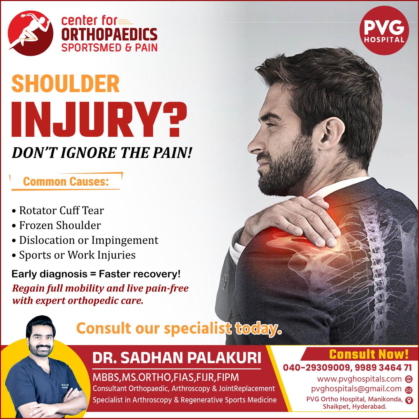 PVG Hospital's Orthopaedics Pain & Sports Injury Center, led by the experienced Dr. Sadhan Palakuri, is dedicated to providing advanced care for bone, joint, and sports-related injuries. With a patient-centric approach and cutting-edge technology, the center offers comprehensive treatment for fractures, joint pain, arthritis, ligament injuries, and more. Dr. Sadhan Palakuri’s expertise ensures personalized treatment plans aimed at faster recovery and long-term wellness. Whether you're an athlete or facing chronic orthopedic issues, trust PVG Hospital for expert care and rehabilitation solutions.