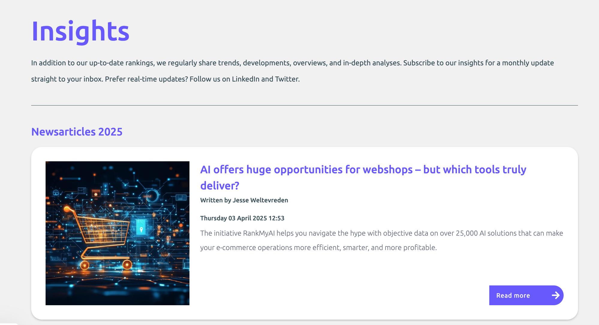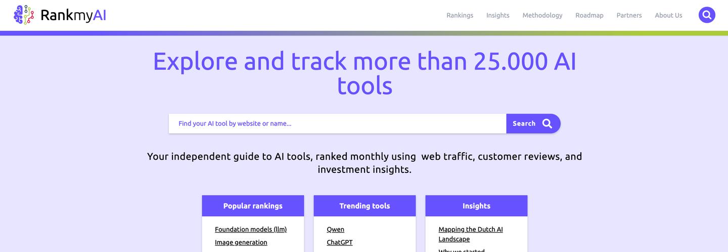 RankMyAI's mission is to rank AI tools, deliver insightful facts and figures, and analyze market trends to help users make informed decisions in this dynamic field. As a non-profit initiative, RankMyAI is proudly supported by the Centre for Market Insights of the Amsterdam University of Applied Sciences. Its commitment to unbiased, high-quality information ensures users have access to the best resources and expertise.