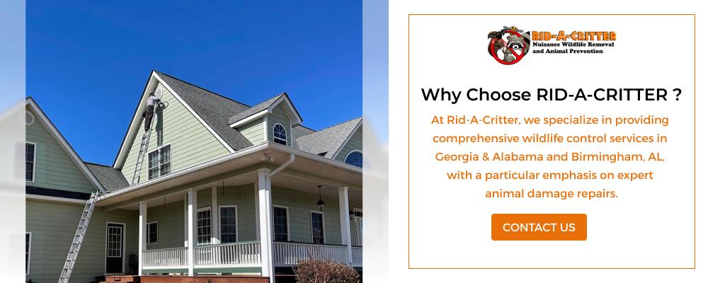 Rid-A-Critter, Inc. provides animal removal services and damage repair in Georgia & Alabama. Our areas of expertise include animal control services, bat removal services, snake removal services, and more. What sets Rid-A-Critter, Inc. apart is our dedication to not only removing wildlife but also expertly repairing the damage caused during the process. We prioritize restoring your property to its original condition, providing a complete and responsible solution to wildlife challenges. Choose Rid-A-Critter, Inc. for professional animal control services, quality repairs, and exceptional customer satisfaction.
