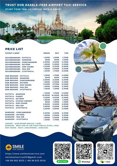 Smile Taxi Service is a trusted private taxi and airport transfer provider in Thailand. We offer reliable transportation from Suvarnabhumi Airport (BKK), Don Mueang Airport (DMK), and U-Tapao Airport (UTP) to popular destinations including Bangkok, Pattaya, Hua Hin, Kanchanaburi, Koh Chang, Ayutthaya, Khao Yai, and Phuket. Our services also cover southern Thailand routes from Phuket to Ao Nang Beach, Patong Beach, and Krabi. With 37+ professional local drivers and 7,000+ satisfied customers worldwide, we provide fixed-rate pricing with no hidden fees, free airport waiting time up to 60 minutes, and meet-and-greet service. Available 24/7 with English-speaking drivers. Book online, via LINE, or WhatsApp for hassle-free travel across Thailand. Pay cash to driver or via PayPal.