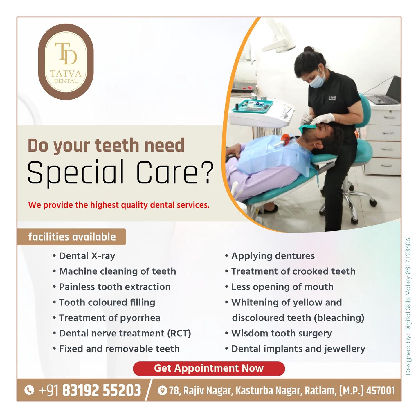 Welcome to Tatva Dental, led by Dr. Rajat Dubey (MDS) and Dr. Nikita Dubey, your trusted dental specialists in Ratlam. We offer advanced, hygienic, and compassionate dental care. Dr. Rajat Dubey (MDS Periodontology & Implantology) is a Govt. Hospital Specialist, MPPSC 3rd Rank holder, and a member of ISOI and IAACD. Dr. Nikita Dubey is a Cosmetic Dentist, Certified Root Canal Specialist, and IAACD (Indian Academy of Aesthetic and Cosmetic Dentistry) member. Our services include dental implants, aligners, orthodontics, cosmetic corrections, veneers, disimpactions, facial surgeries, periodontal surgeries, and teeth whitening. At Tatva Dental, we blend modern technology with a patient-first approach to give you the smile you deserve.