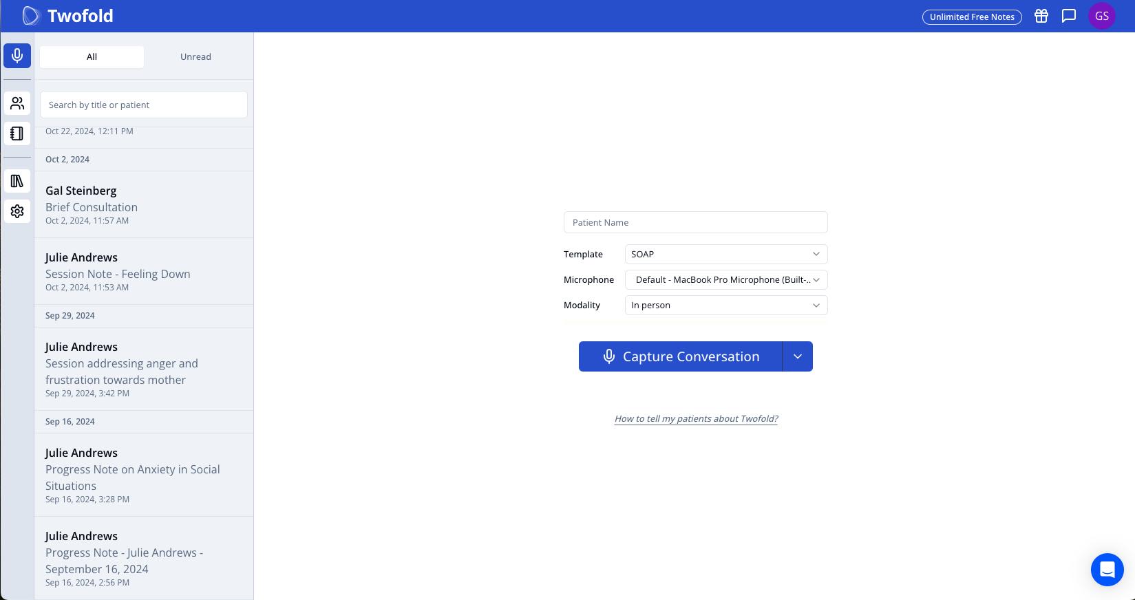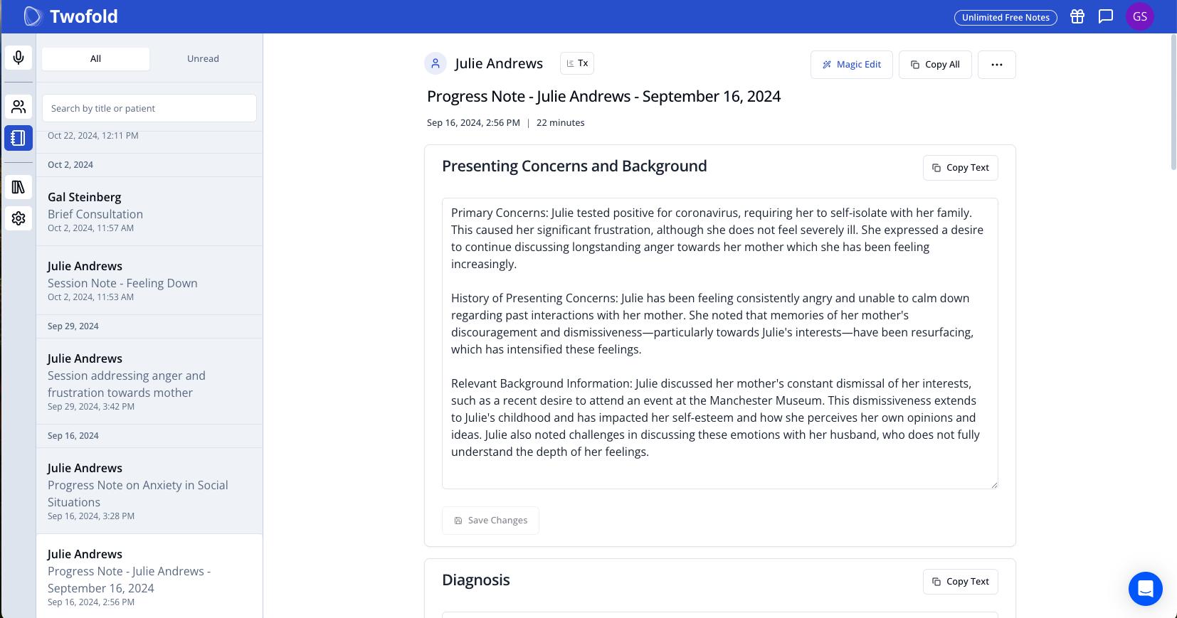 Twofold Health is transforming medical documentation with AI-driven automation, helping mental health professionals save time on note-taking. Our platform ensures accuracy, compliance, and seamless integration with existing healthcare systems.
