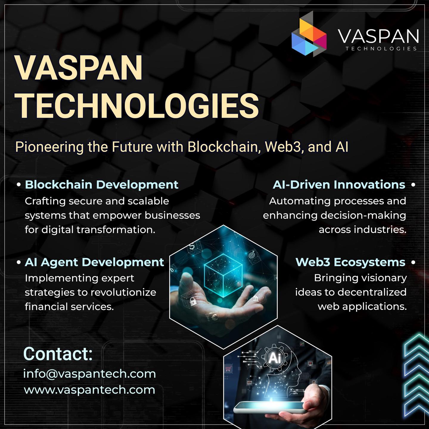 Vaspan Technologies is a pioneering software company located in Baner, Pune, India, with a global presence in Dubai and the USA. We specialize in Telegram Mini App and bot development, blockchain solutions, DeFi platforms, Web3 integration, and AI-powered applications. Our expert team excels in AI agent development, LLM integration, and custom blockchain and AI solutions tailored to your business goals. Vaspan Technologies is a trusted healthcare software partner in India and abroad, building secure, scalable platforms for the medical and wellness sectors. From custom software to Web3 and AI tools, we deliver innovation, excellence, and security. Partner with us to lead the digital future.