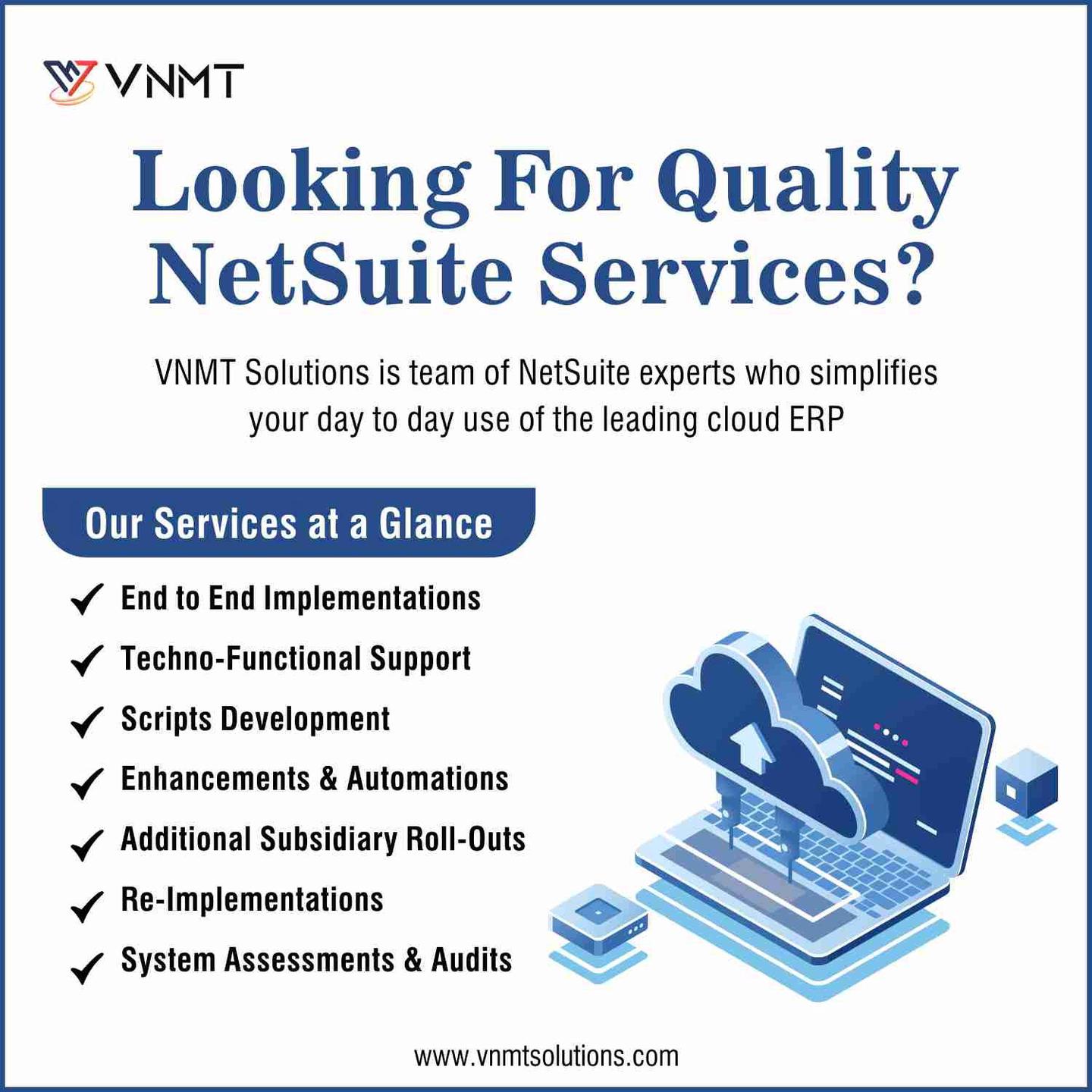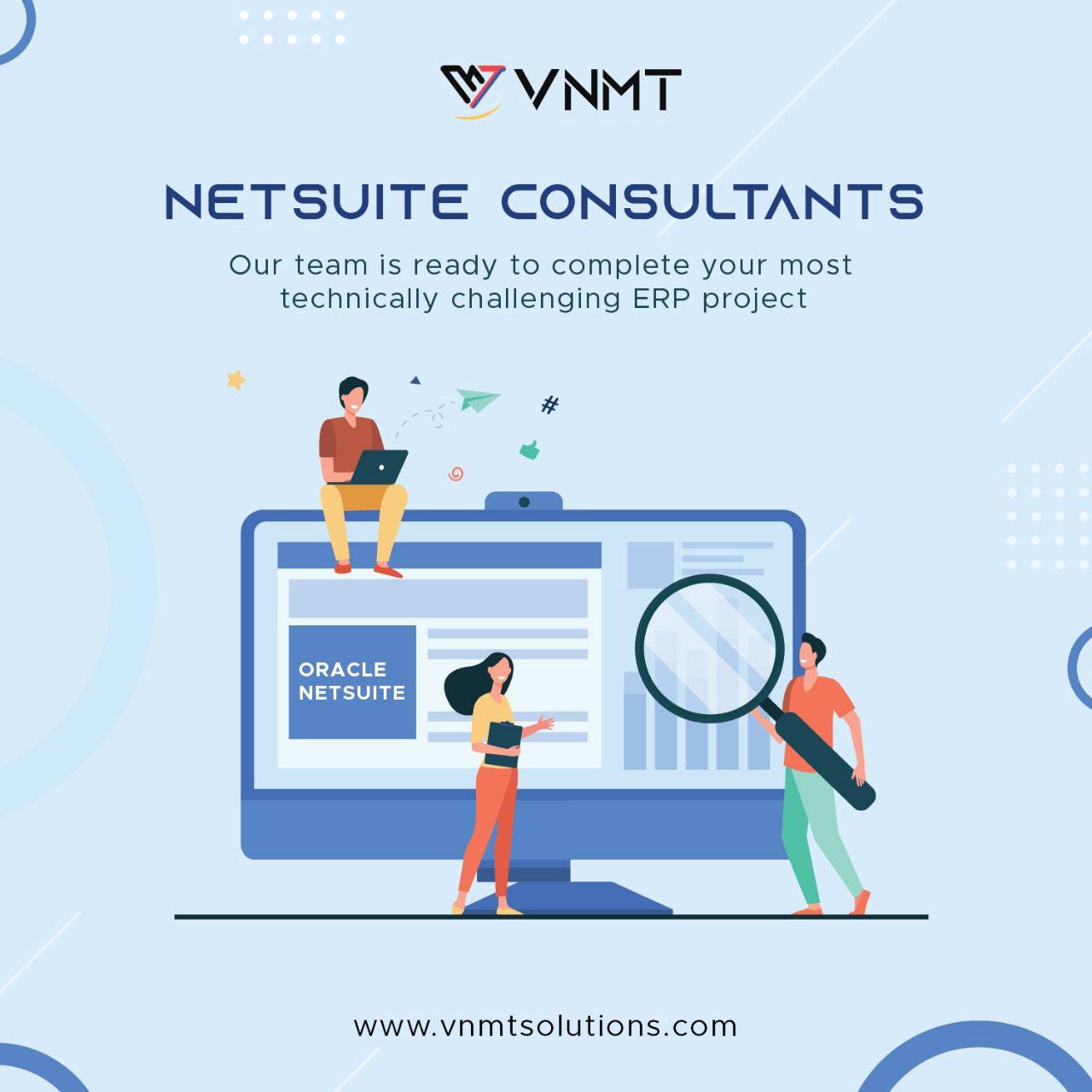 VNMT Solutions is a NetSuite alliance partner and consultant solution provider with a global footprint and industry-acclaimed services. Starting our journey in 2017 and headquartered in Melbourne, Australia, we provided widely benchmarked and future-ready NetSuite development services to an array of global corporations. With a robust team of NetSuite consultants, developers, experts, and strategists, we help businesses integrate the NetSuite cloud software platform for a multitude of business processes including operations, ERP, CRM, customer relations, logistics, and supply chain, e-commerce, and many others. In addition, We cater to specific business requirements with our custom and future-focused NetSuite solutions, including NetSuite Implementations, Administration, Customization, and NetSuite SuiteCommerce.