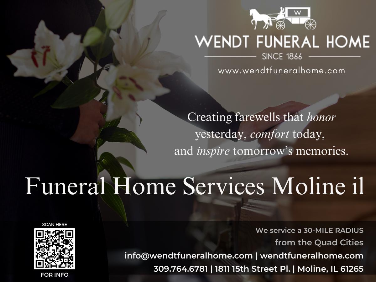 Welcome to Wendt Funeral Home, a deeply rooted, family-owned institution serving the Illinois–Iowa Quad Cities for six generations. Founded in 1866, our legacy is built on compassion, trust, and personal care.At Wendt, we believe that life is an incredible journey and that every story matters. Wendt Funeral Home+1 We are committed to honoring your loved one in a way that celebrates their legacy — offering funeral, cremation, and veterans’ services, along with meaningful personalization. For More Details Click on the Link https://www.bunity.com/wendtfuneralhome